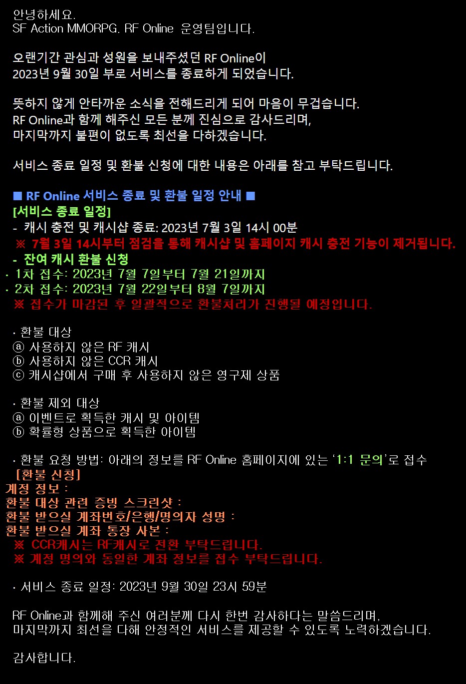 재미좀 붙이고 블로그도 이거저거 써가면서 해볼까 하던 RF온라인이 서비스종료 공지가 떳습니다.