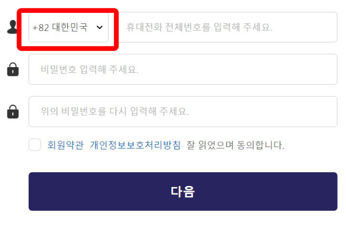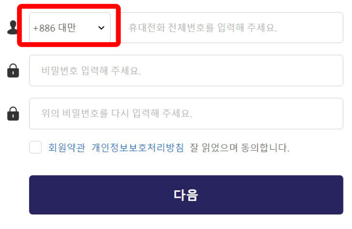 측 상단 회원가입을 누르시고 회원가입 진행해줍니다. 휴대폰번호만 있으면 가능합니다. +886대만이라고 써있는 부분을 눌러서 +82 대한민국으로 바꿔주시고 휴대폰 번호와 비밀번호를 입력하시면 계정 생성이 가능합니다.