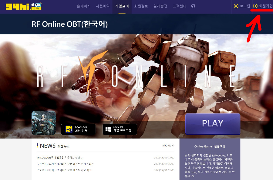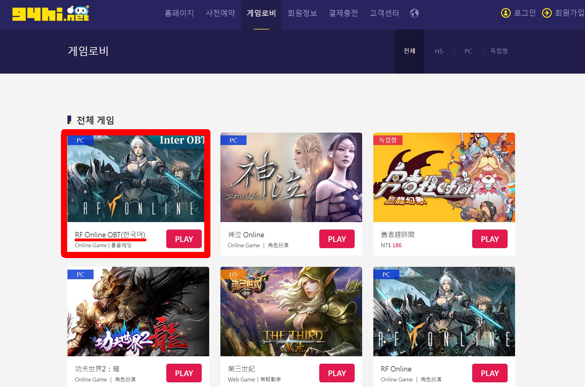 맨위에서 게임로비 -> RF Online OBT(한국어)를 선택해서 이동해줍니다. 그냥 RF Online은 대만섭인거 같습니다 잘보고 누르셔야합니다.
