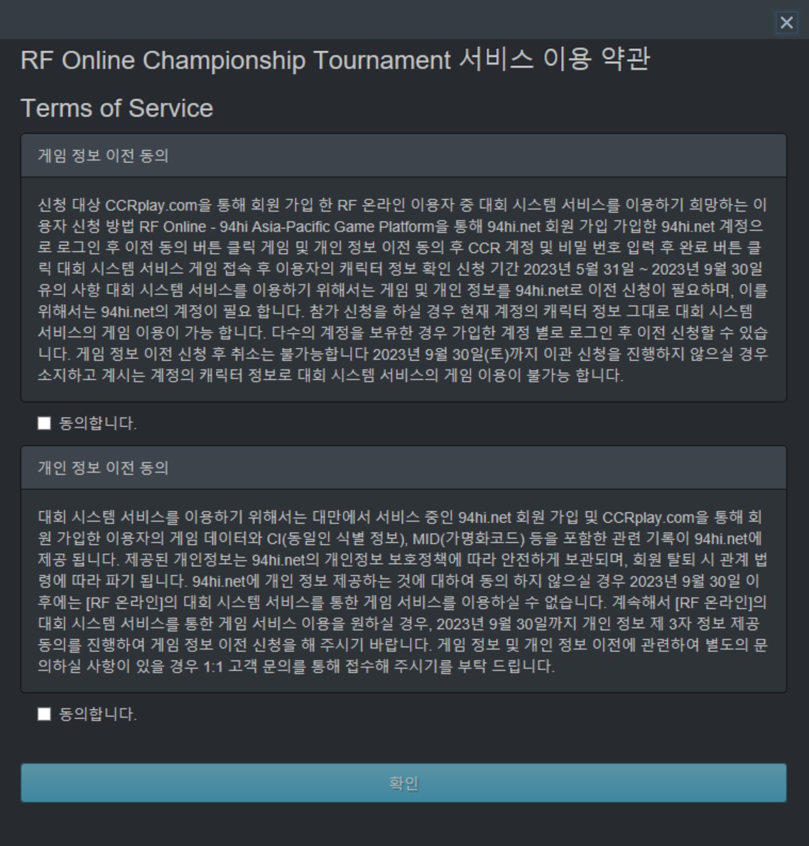 이러쿵 저러쿵 말 많은데 대충 CCR에 있는 개인정보를 받아다가 쓴다는 내용 같았습니다. 한번 읽어보세요. 동의에 둘다 체크하고 확인을 누르면 기존 한국섭 아이디와 비밀번호를 넣고 인증을 누르시면 됩니다.